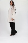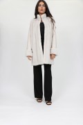 This light coat is made of wool fabric and Kopenhagen Fur "ice vevlet" mink fur, very soft and very bright. These two materials worked harmoniously make it an elegant coat. The mink worked in extension is placed on the front and the cuffs. The back and the sleeves are in wool fabric. It is warm and very comfortable to wear. Its small high collar has a magnetic closure to protect you from the cold. Its length is 90 cm.
