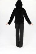 Magnifique veste à capuche réalisée en fourrure de vison noir "Black Velvet". Cette qualité de vison est très douce au toucher et la densité des poils est telle qu'on la compare au velours. Très joli travail en bandes horizontales sur les manches et en pleines peaux sur le devant et le dos. C'est une veste à la ligne racée, très élégante que vous porterez tous les jours et en toutes circonstances.